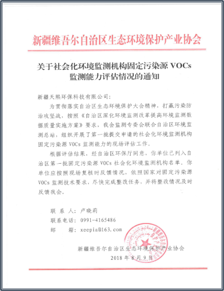 2018年8月获得自治区社会化环境监测机构固定污染源VOCs监测能力评估;